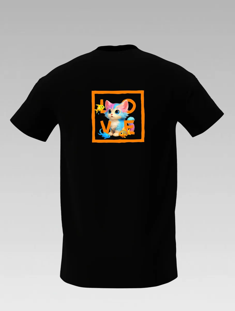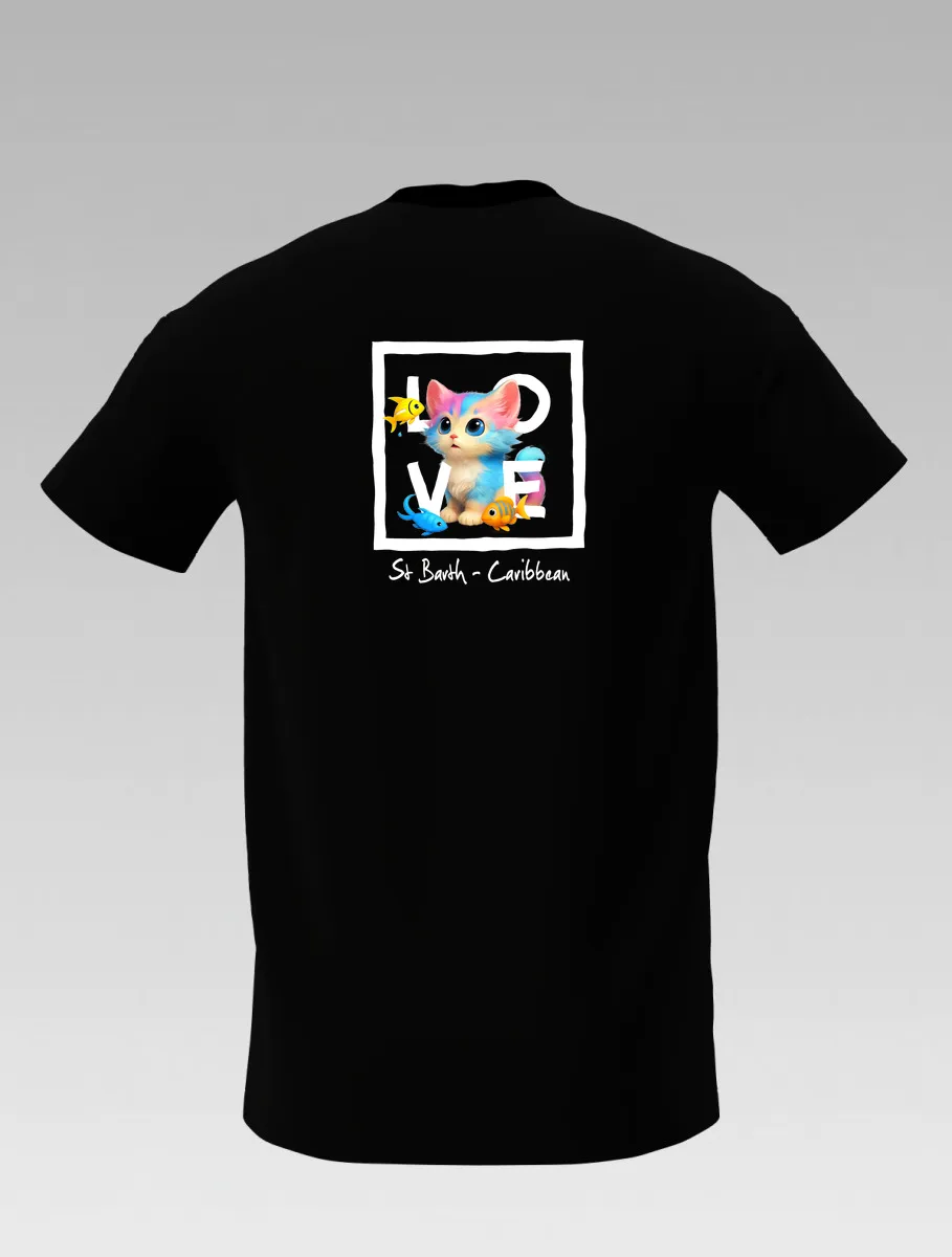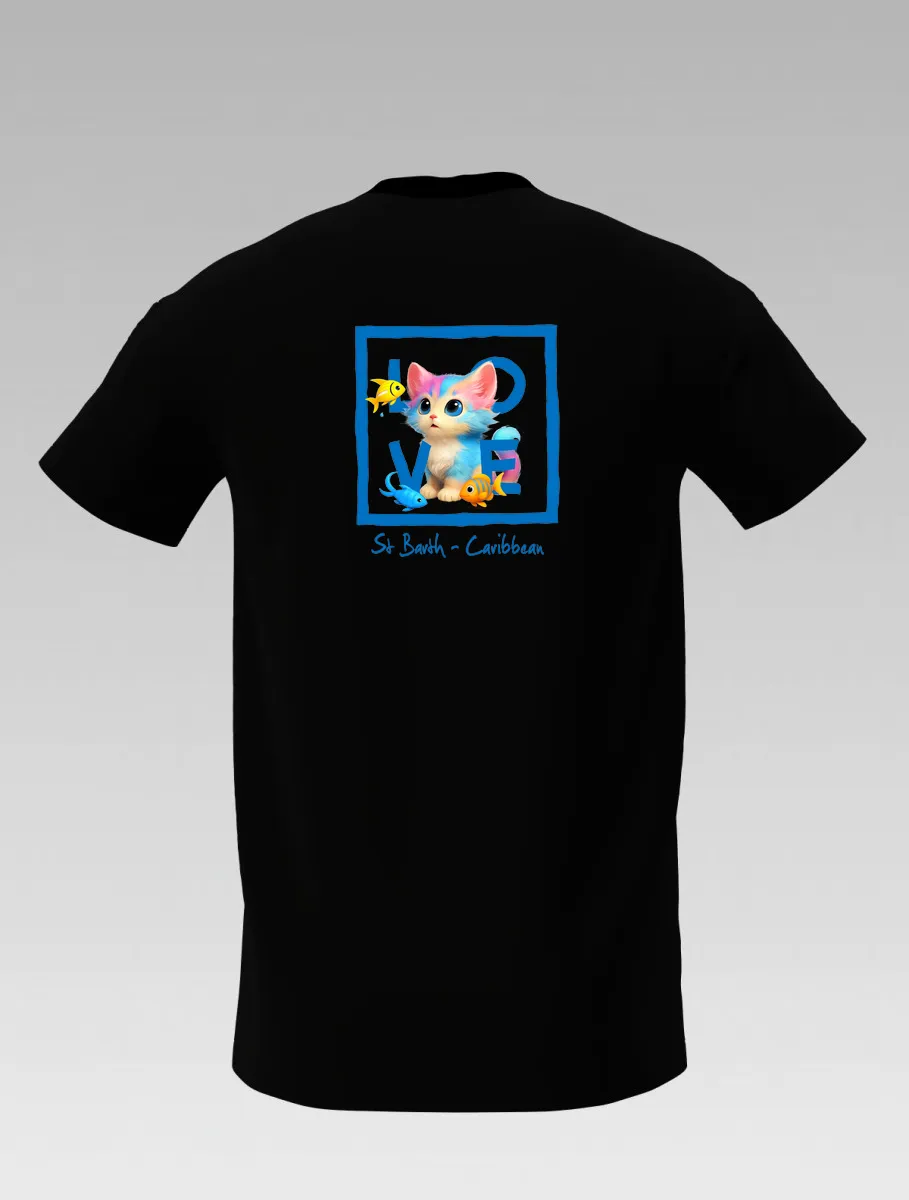 Black Kids’ T-shirt – Playful Cat and Fish – St Barth & St Martin Signature – LOVE Edition