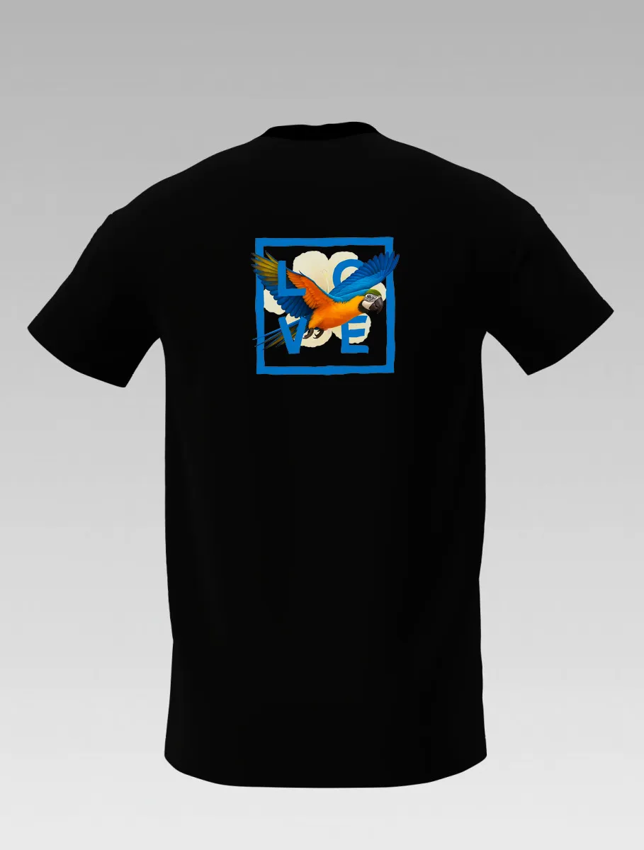 The colorful parrot spreads its wings across the dark fabric, symbolizing freedom, joy, and the vibrant spirit of the islands.