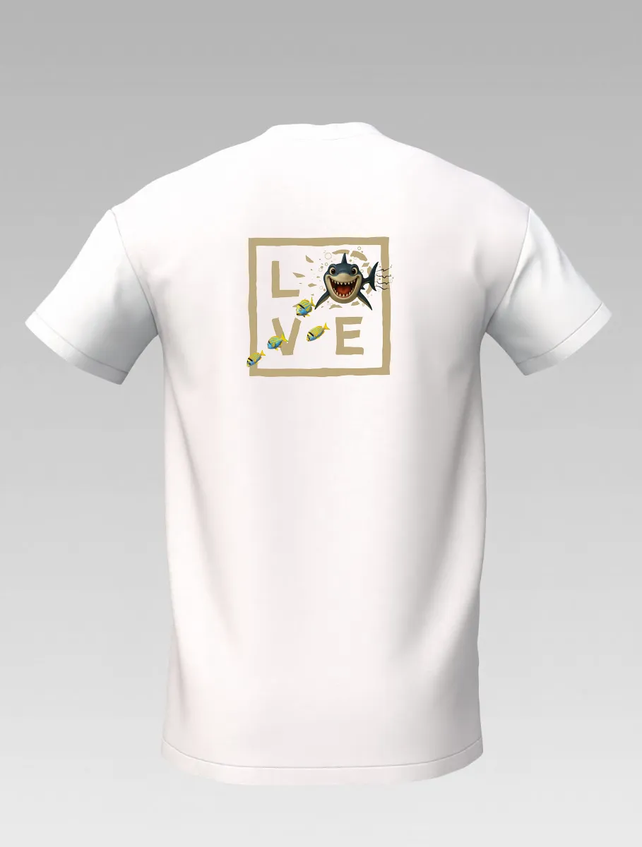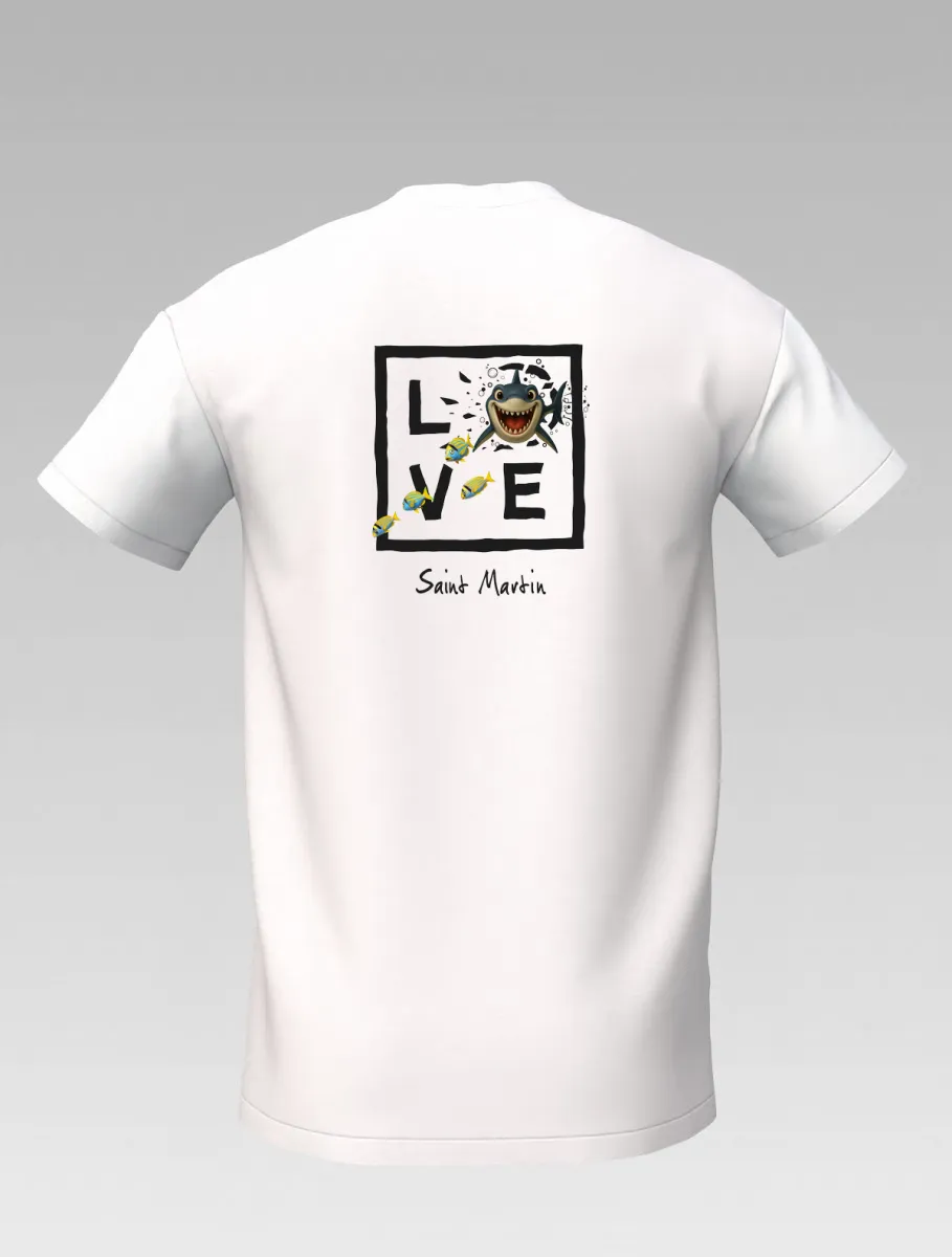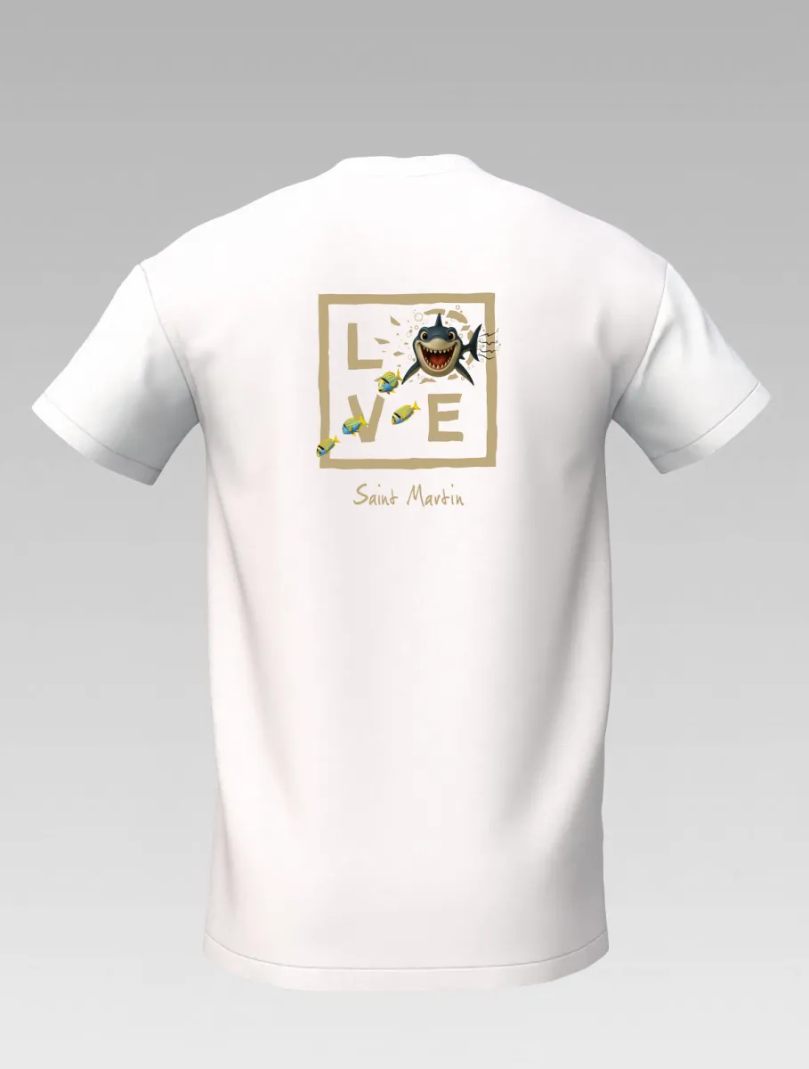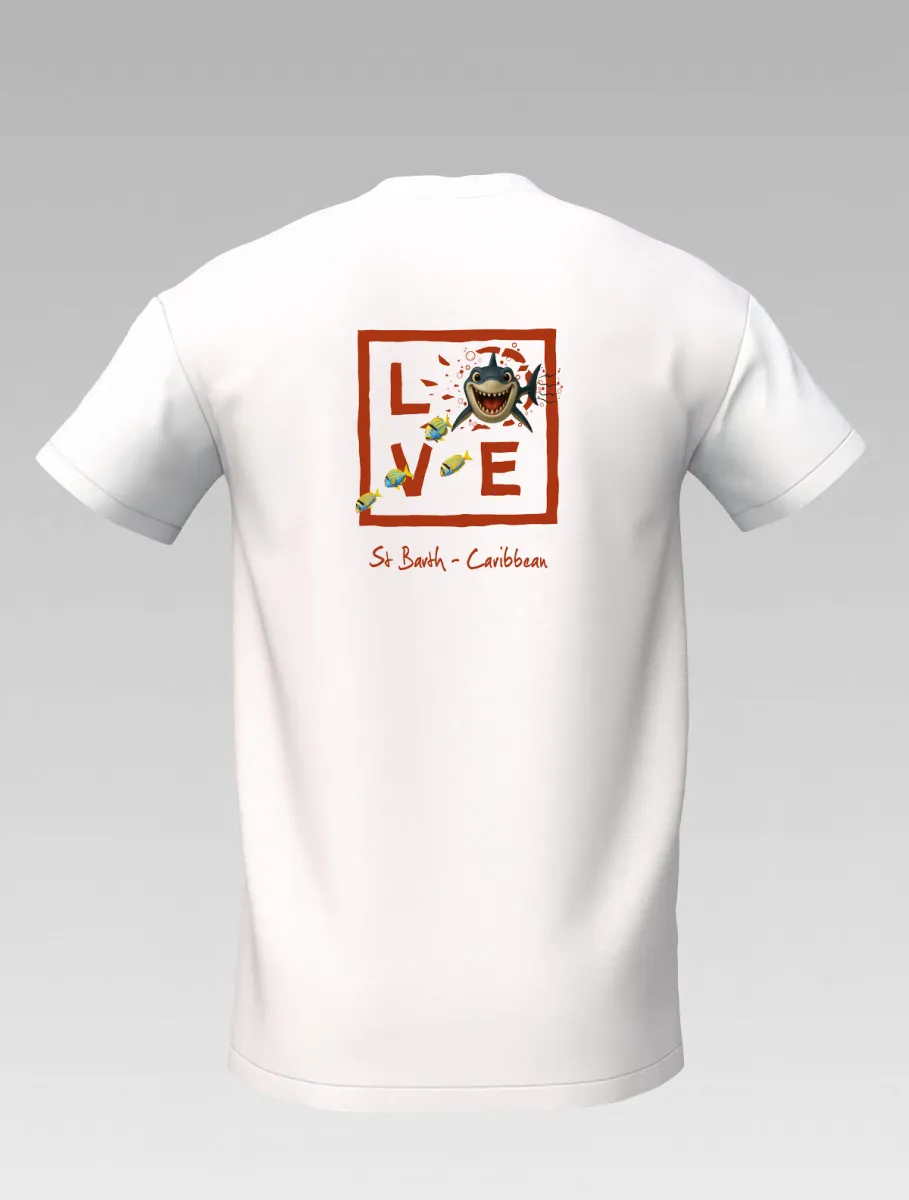 This white T-shirt from St Barth & St Martin, part of the LOVE Shark line, brings the thrill of the ocean to life.