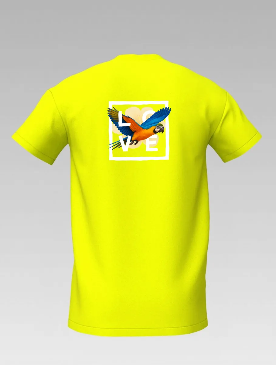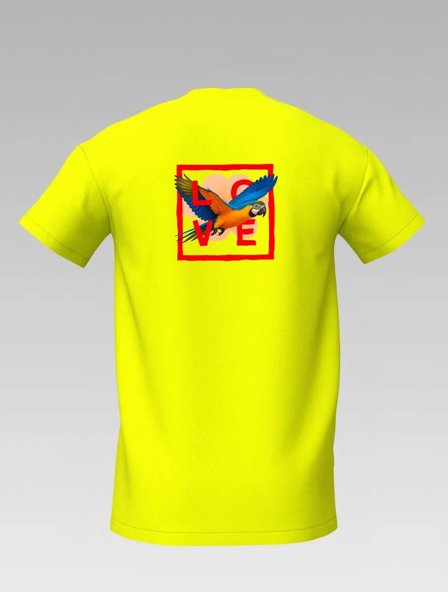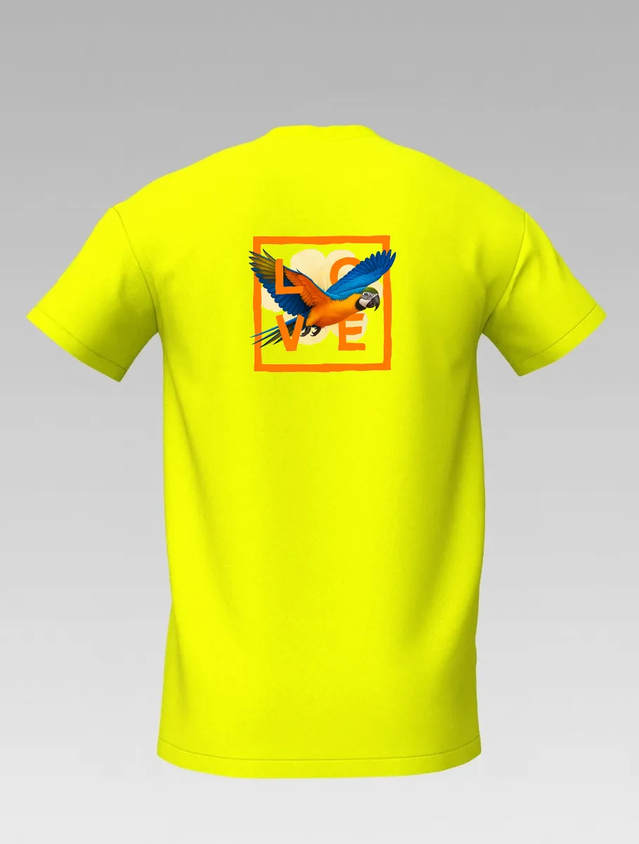 The colorful parrot spreads its wings across the fabric, symbolizing freedom, happiness, and the vibrant spirit of the islands.