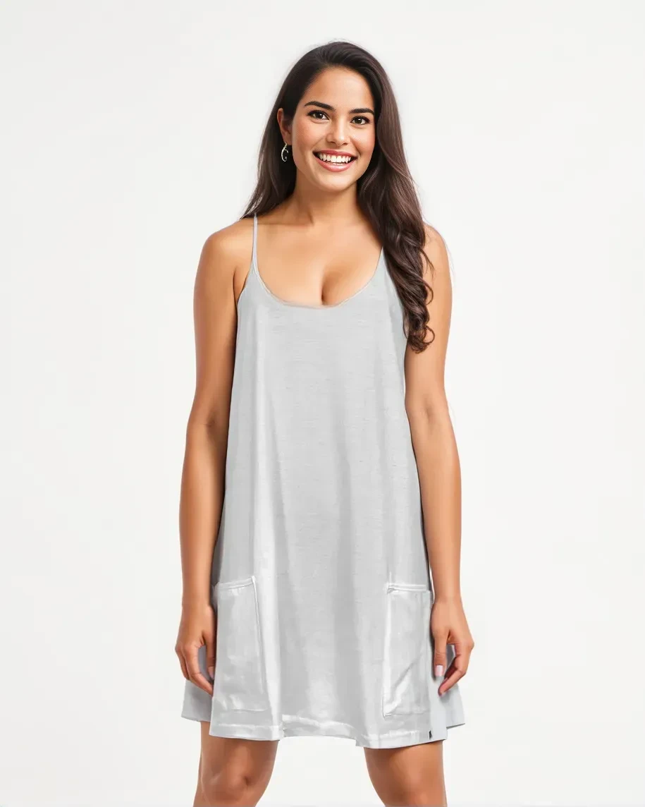 The dress falls just above the knees, featuring a delicate bustier with fine "dauphine" straps in the front. At the back, the straps form a "Marcel" tank shape, leaving the shoulders beautifully exposed for a chic yet casual look.