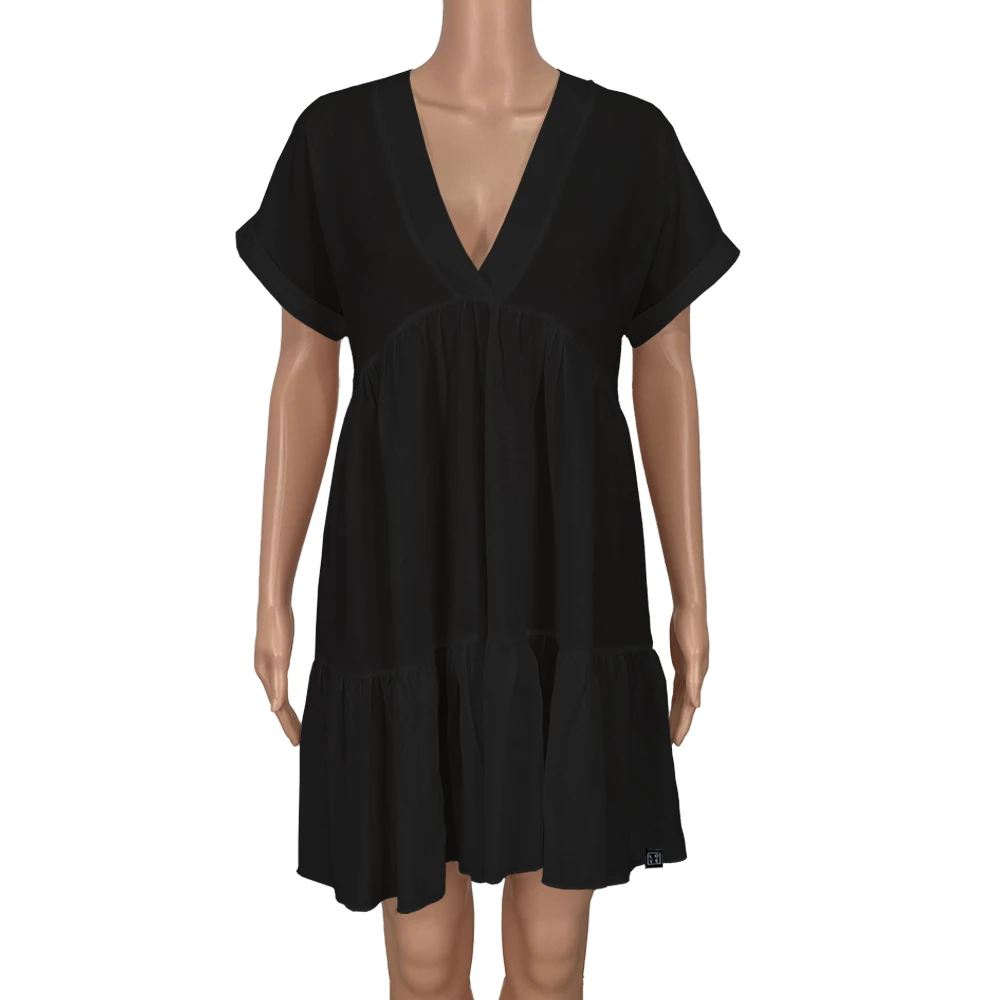 The Eva Dress combines comfort and elegance in a light, flowing silhouette. Its V-neckline and wide sleeves add a touch of freshness and movement, while the loose fit drapes naturally and gracefully.