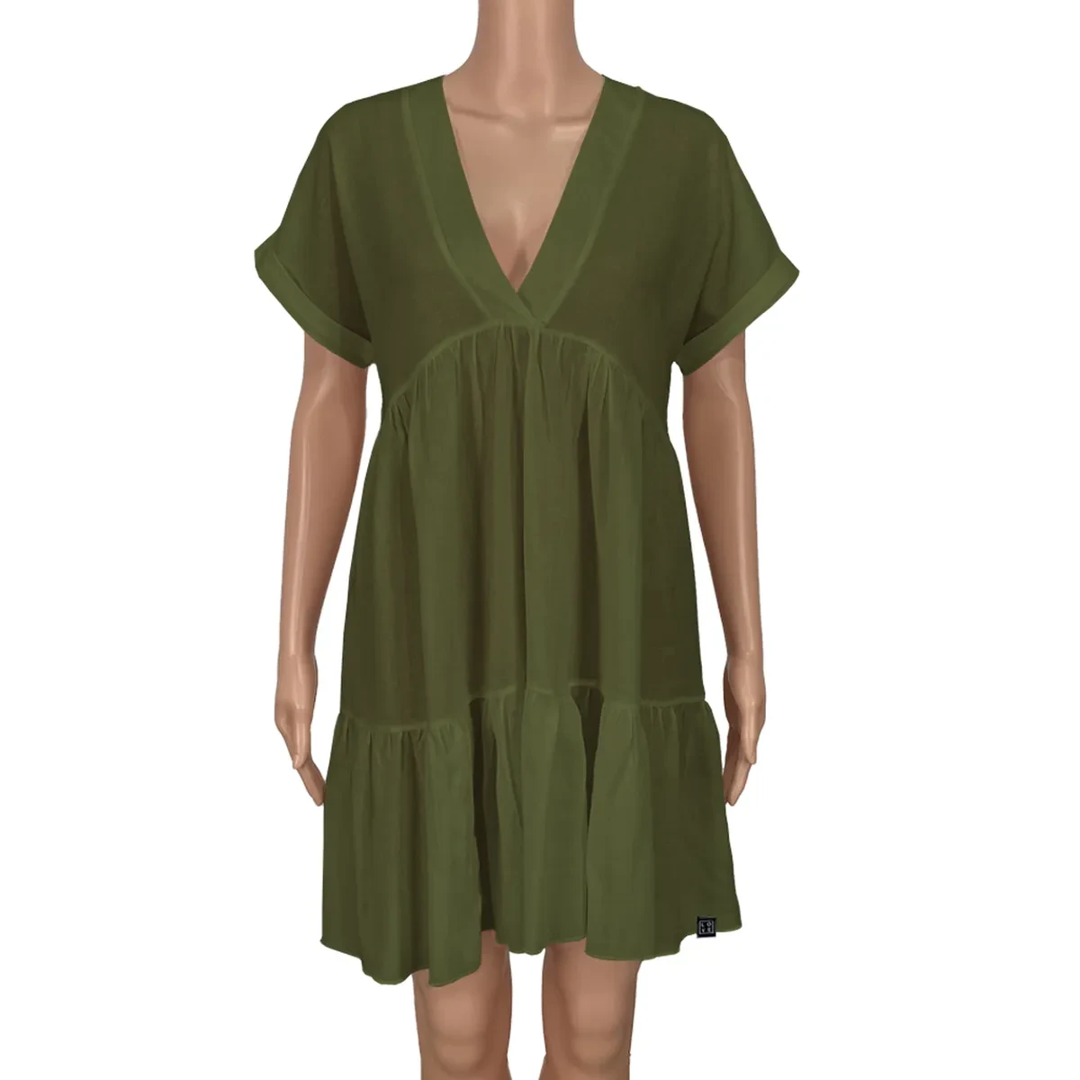 The Eva Dress combines comfort and elegance in a light, flowing silhouette. Its V-neckline and wide sleeves add a touch of freshness and movement, while the loose fit drapes naturally and gracefully.