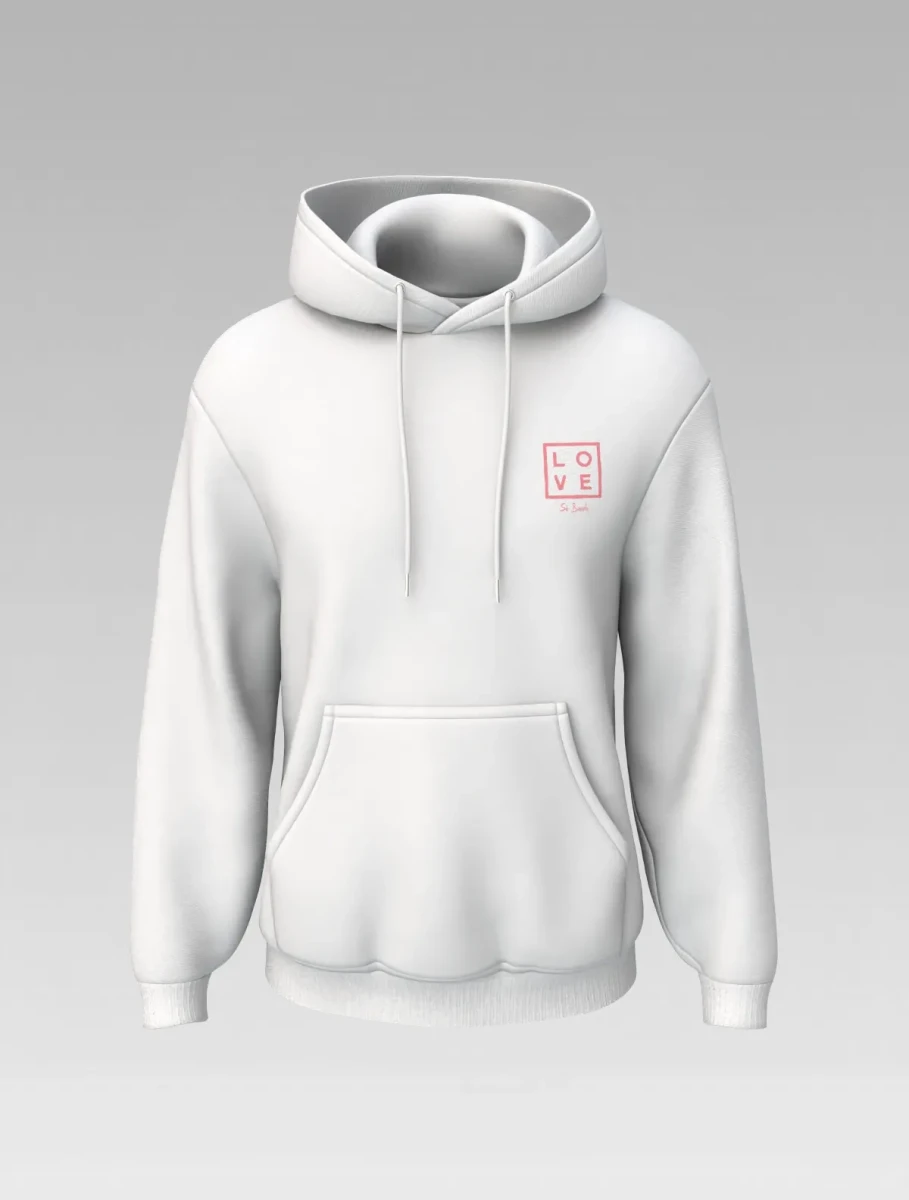 This white LOVE hoodie features the brand's iconic bear — a symbol of freedom, joy, surfing, and marine adventures. The design showcases the bear on a surfboard, with multiple color variations of the LOVE logo for extra fun and style.