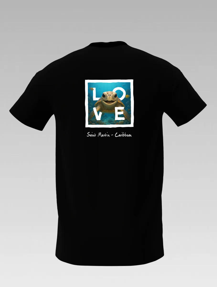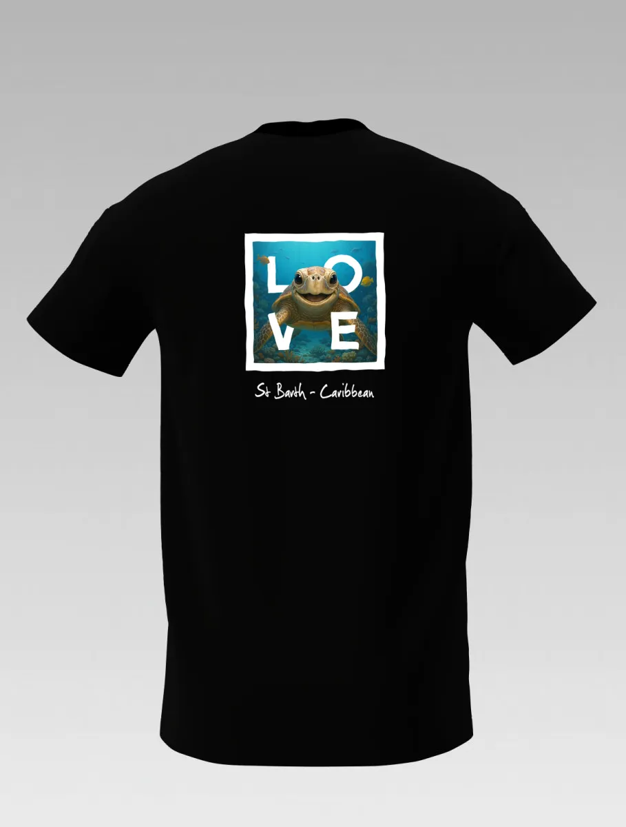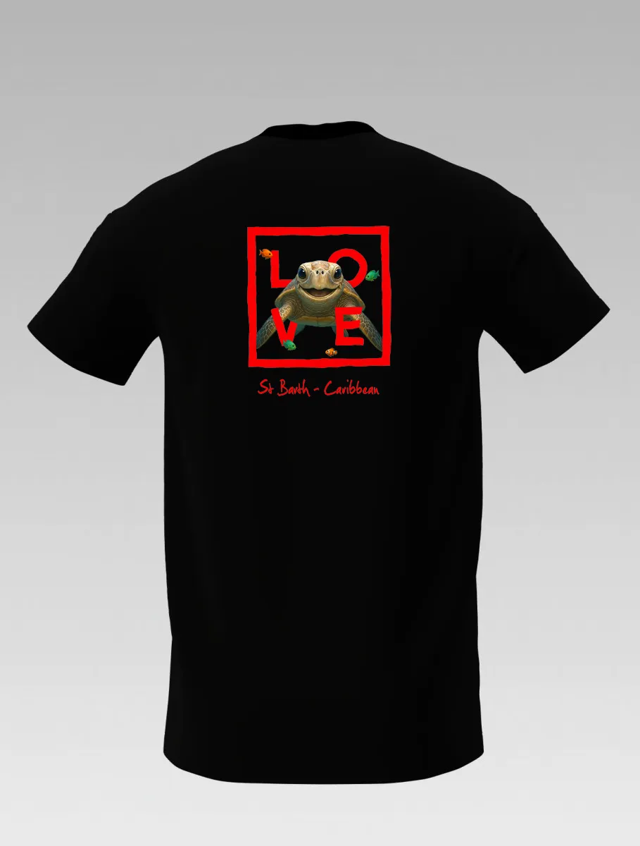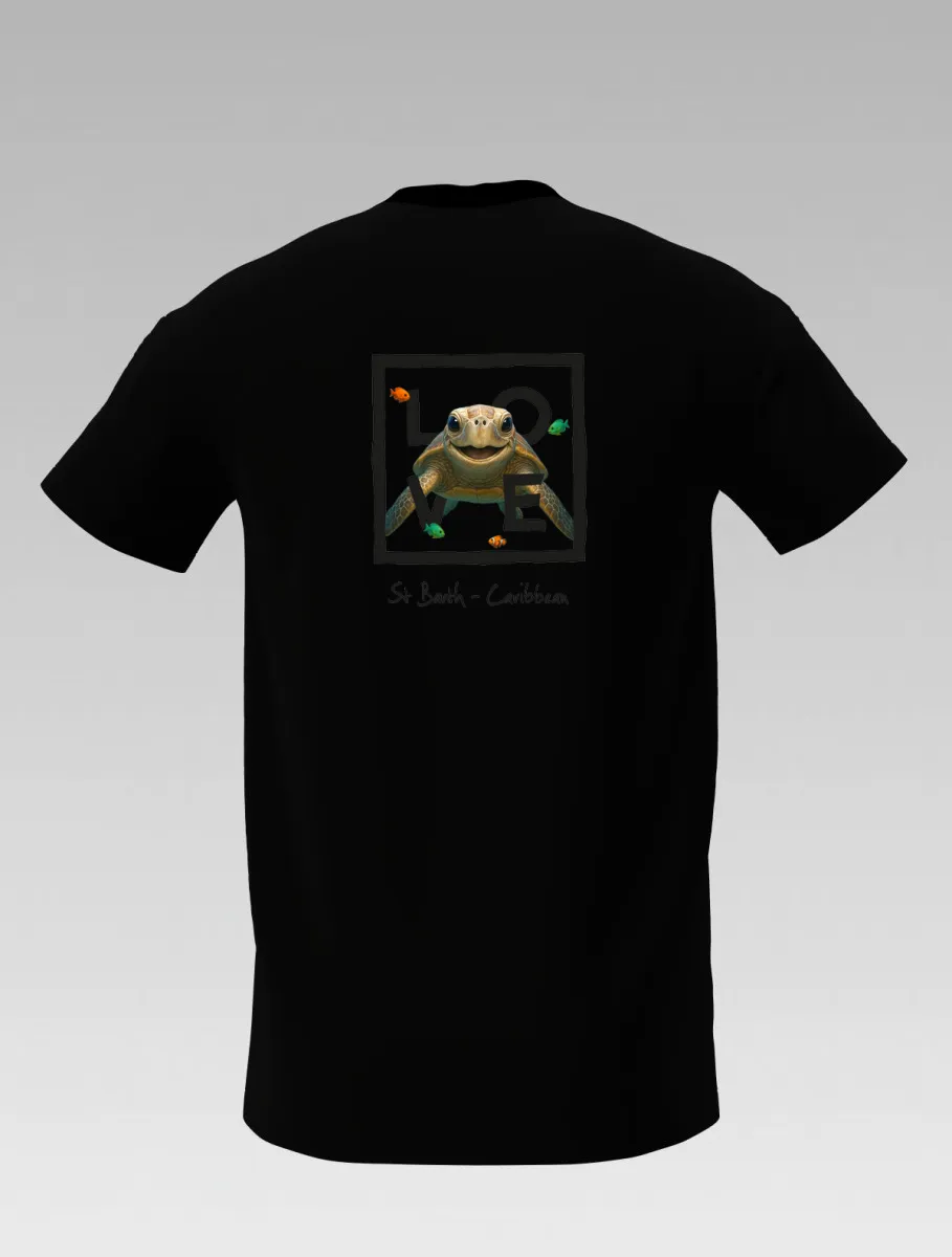 This black T-shirt from St Barth & St Martin, part of the LOVE line, captures the sweetness and serenity of the ocean through a cheerful turtle swimming among corals and tropical colors.