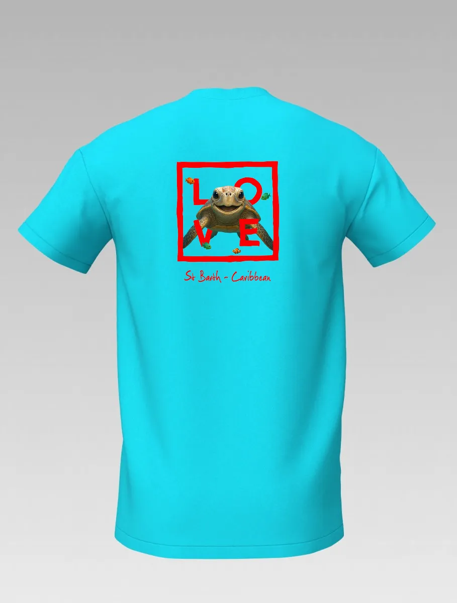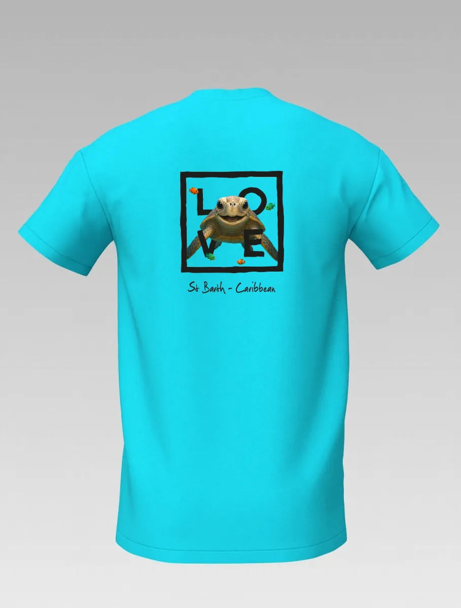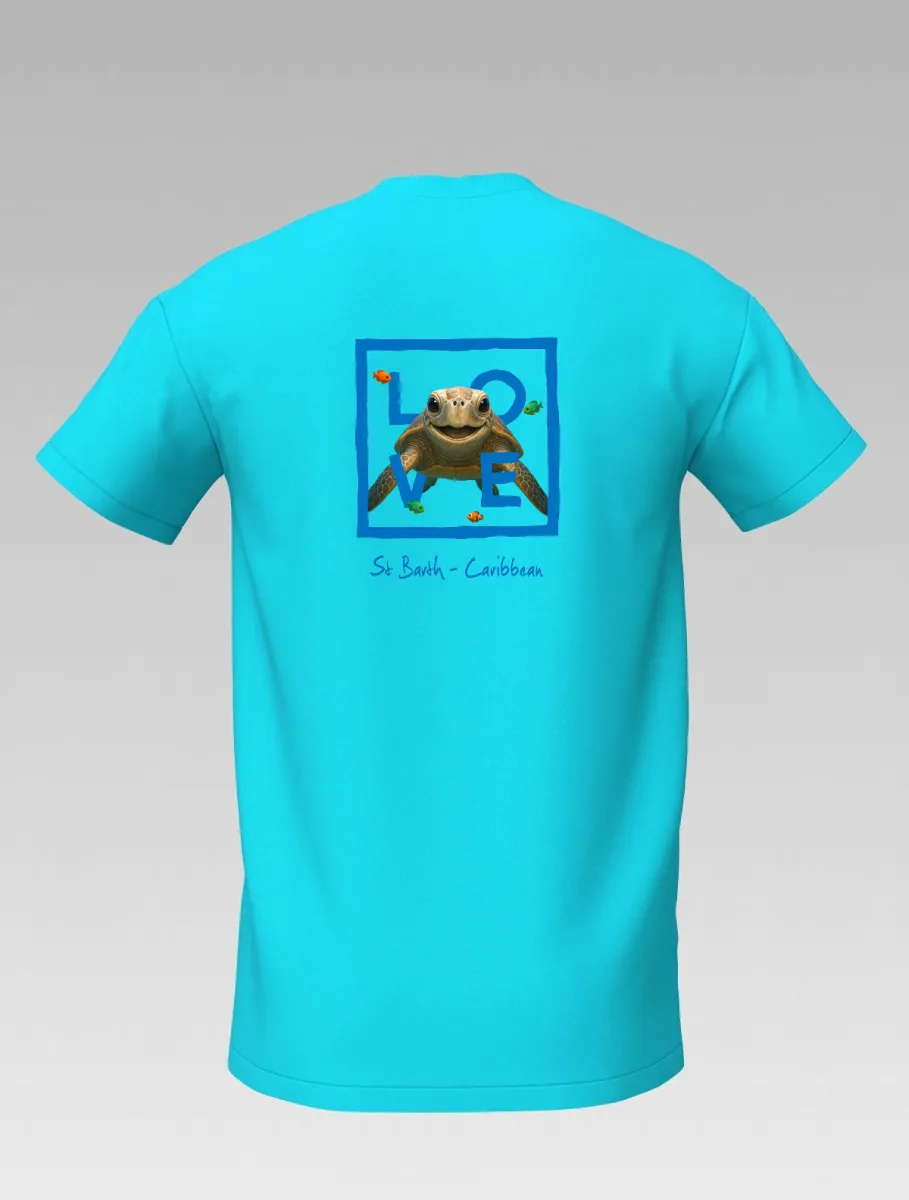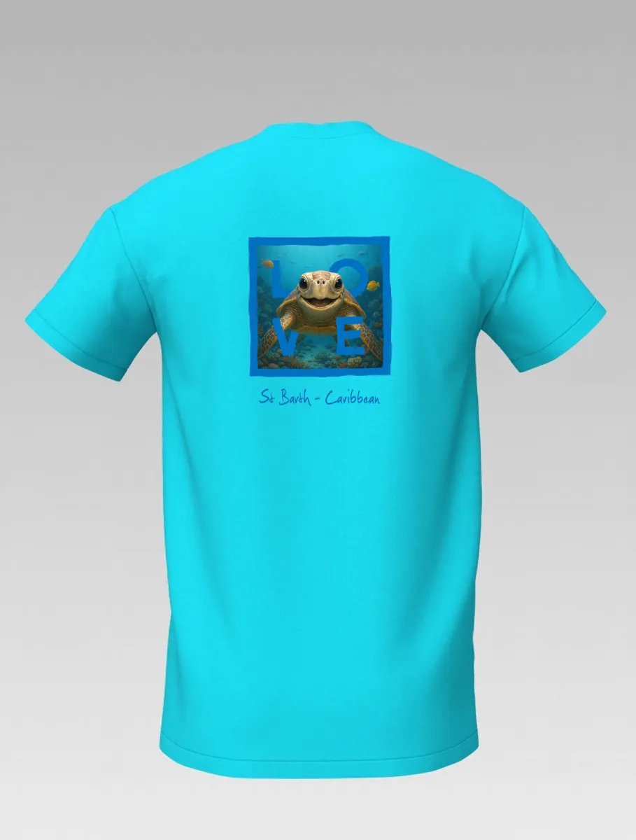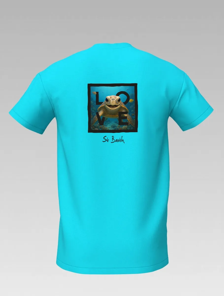 This turquoise T-shirt from St Barth & St Martin, part of the LOVE line, captures the sweetness and serenity of the ocean through a cheerful turtle swimming among corals and tropical colors.