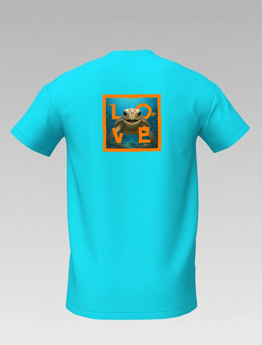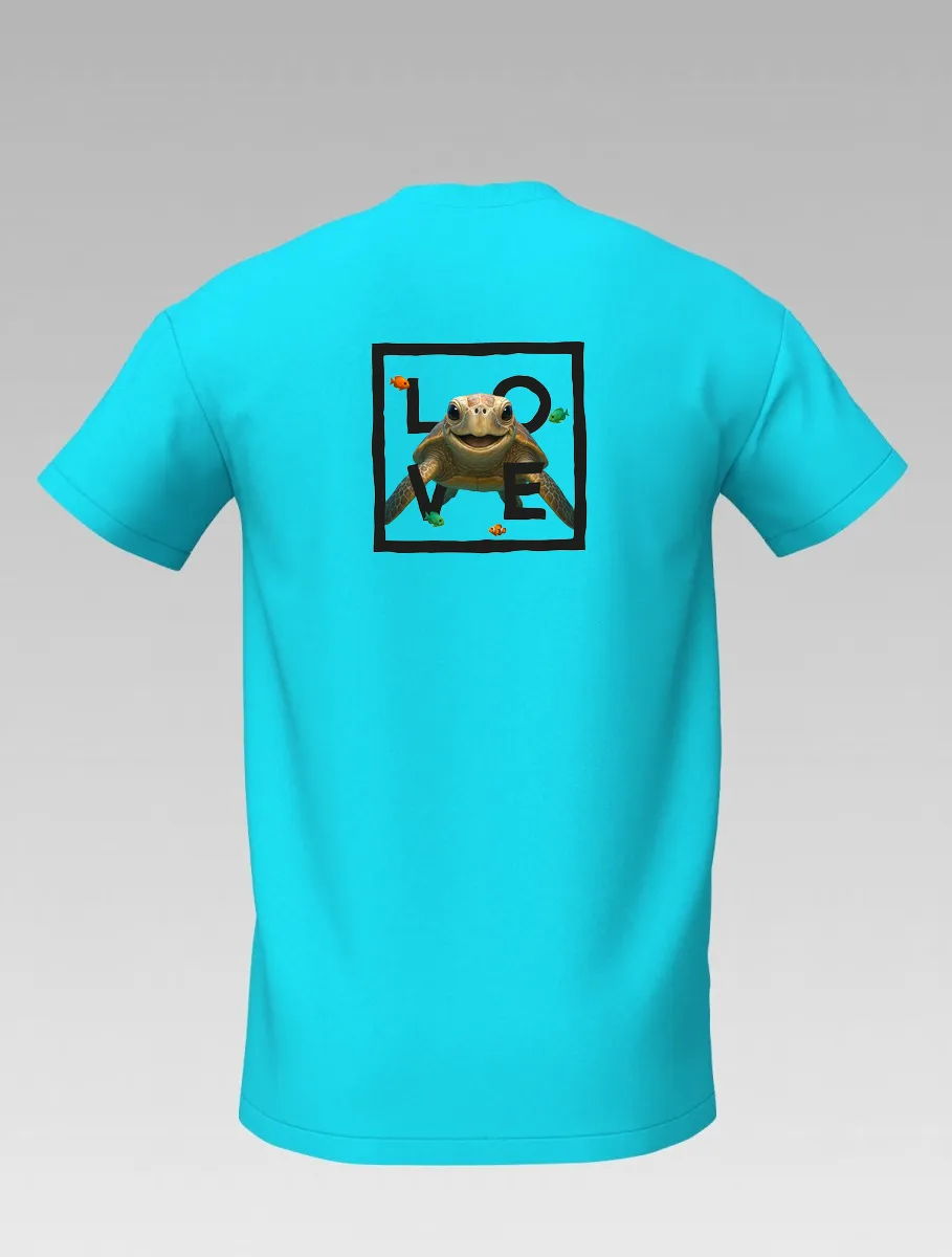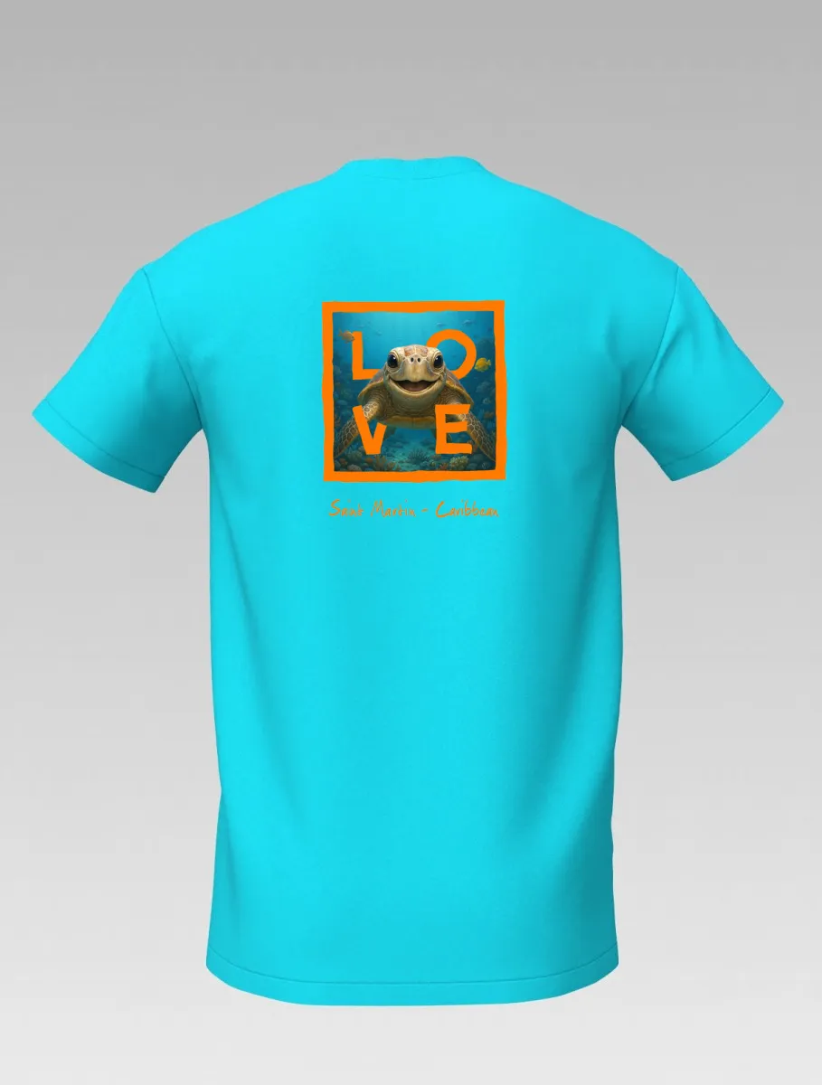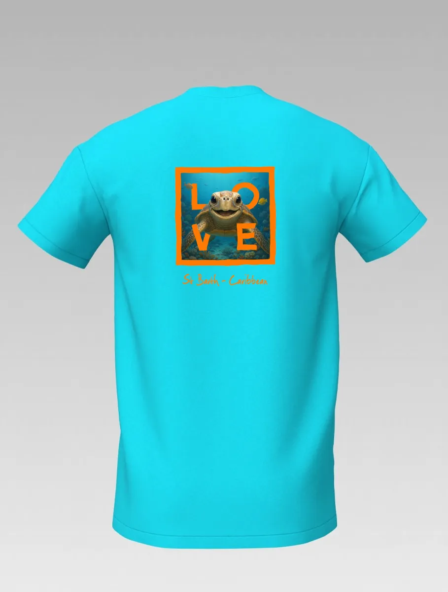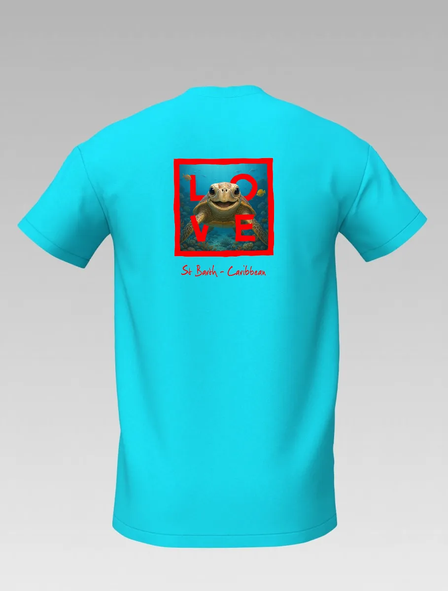 This turquoise T-shirt from St Barth & St Martin, part of the LOVE line, captures the sweetness and serenity of the ocean through a cheerful turtle swimming among corals and tropical colors.