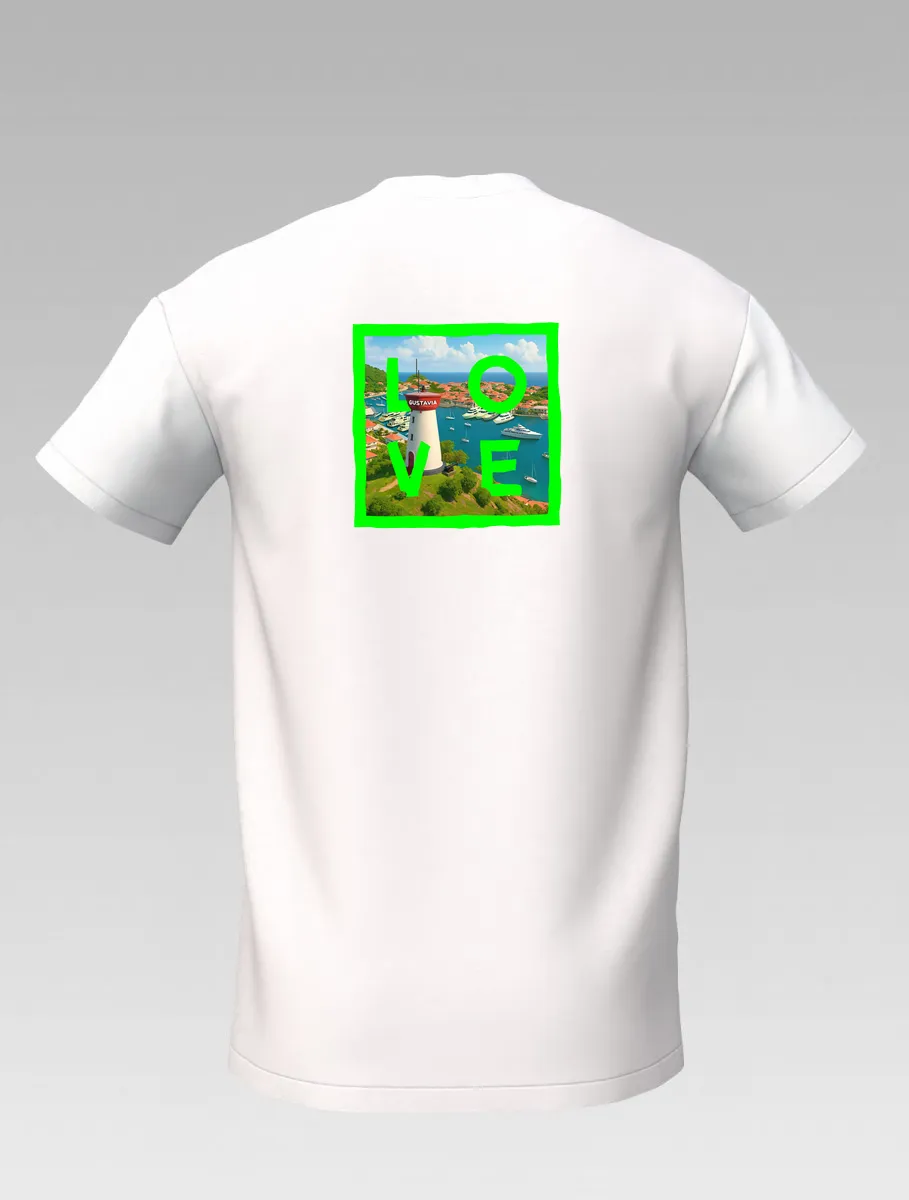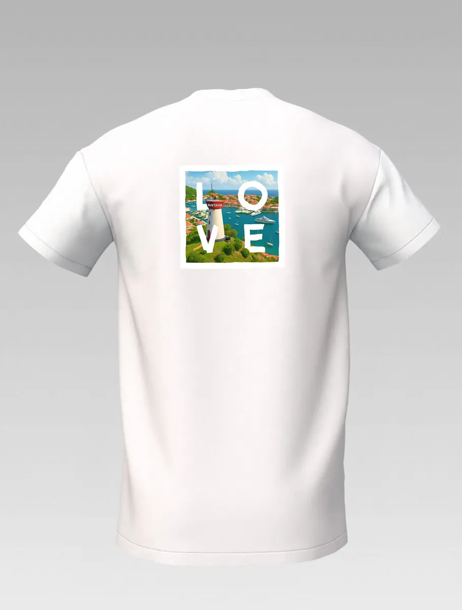 This white T-shirt from St Barth Signature, part of the LOVE Edition, celebrates the beauty of Gustavia Harbor, where boats rest on crystal-clear waters and colorful houses light up the horizon.