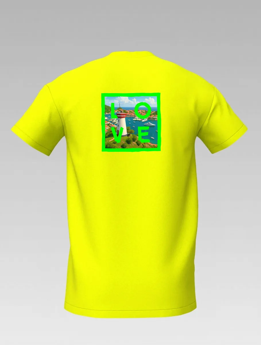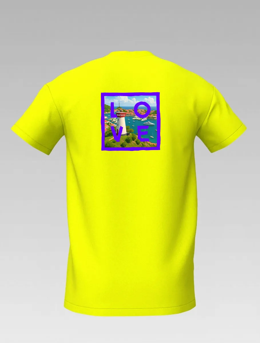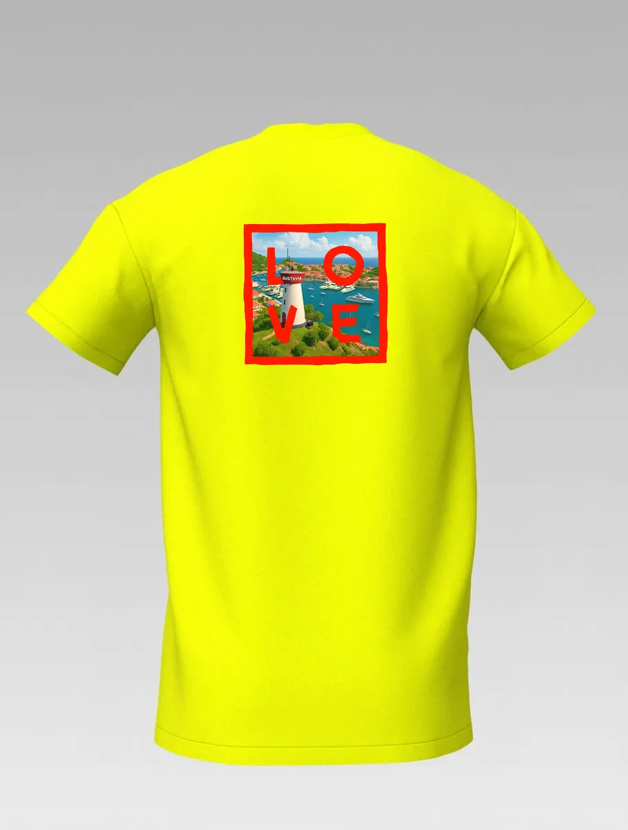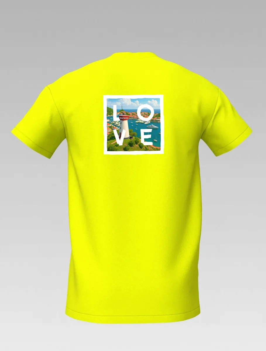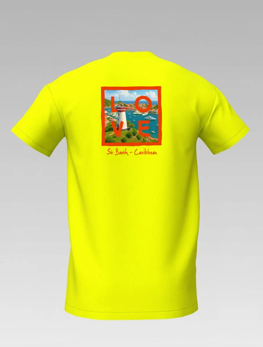 This yellow T-shirt from St Barth Signature, part of the LOVE Edition, celebrates the beauty of Gustavia Harbor, where boats rest on turquoise waters and colorful houses light up the horizon.