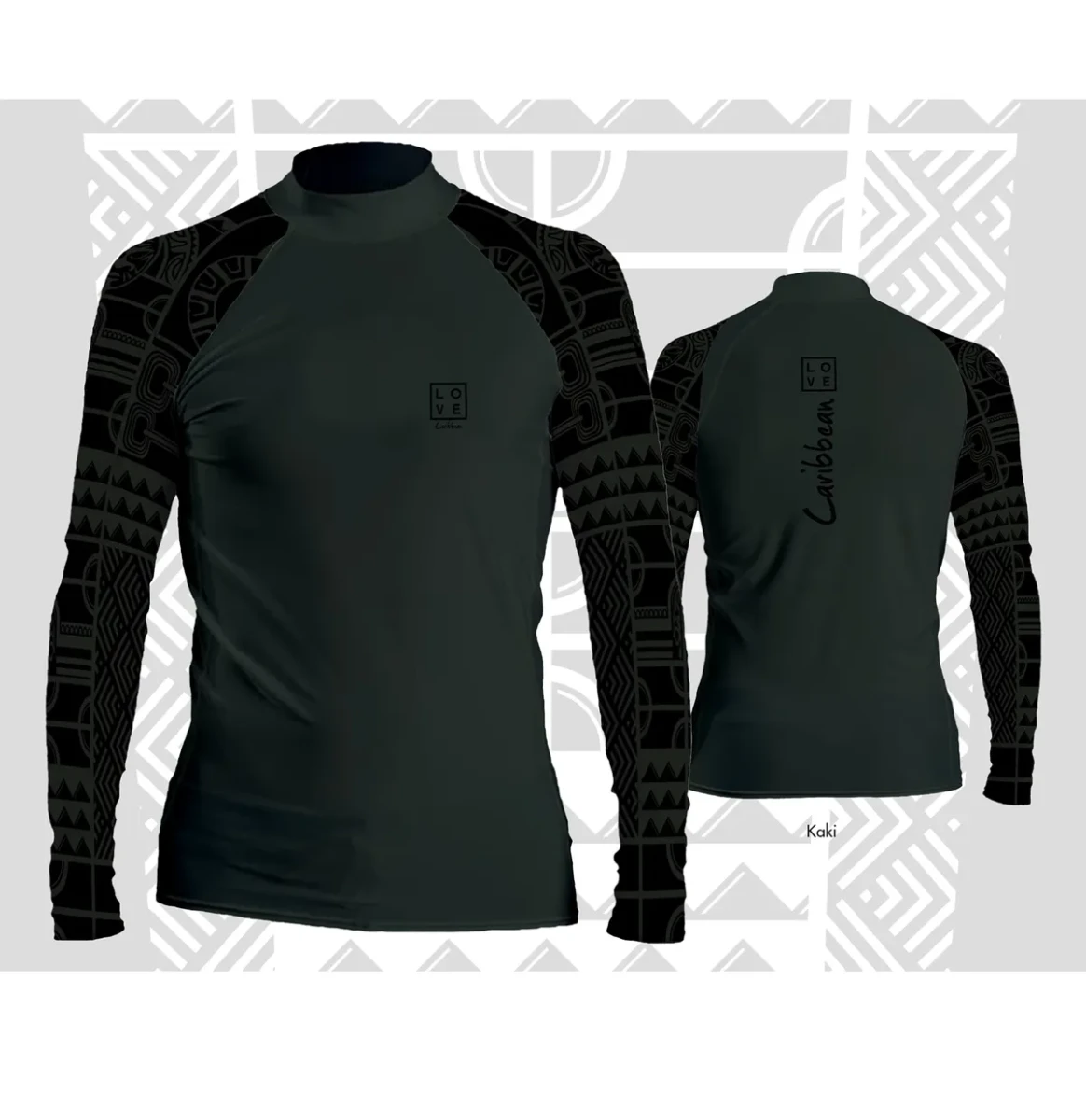 Discover the LOVE Caribbean unisex long-sleeve lycra, designed to support your active lifestyle and moments of relaxation by the sea.