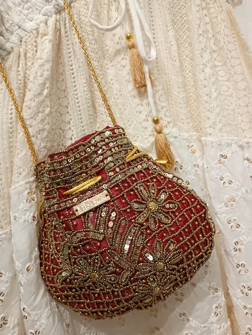 An exclusive evening accessory with a boho-chic flair, the golden sequin pouch bag is perfect for those seeking a unique and elegant touch. Its golden embroidery, delicate pearls, and shimmering details make it a standout piece that adds both personality and sophistication to your event outfit.