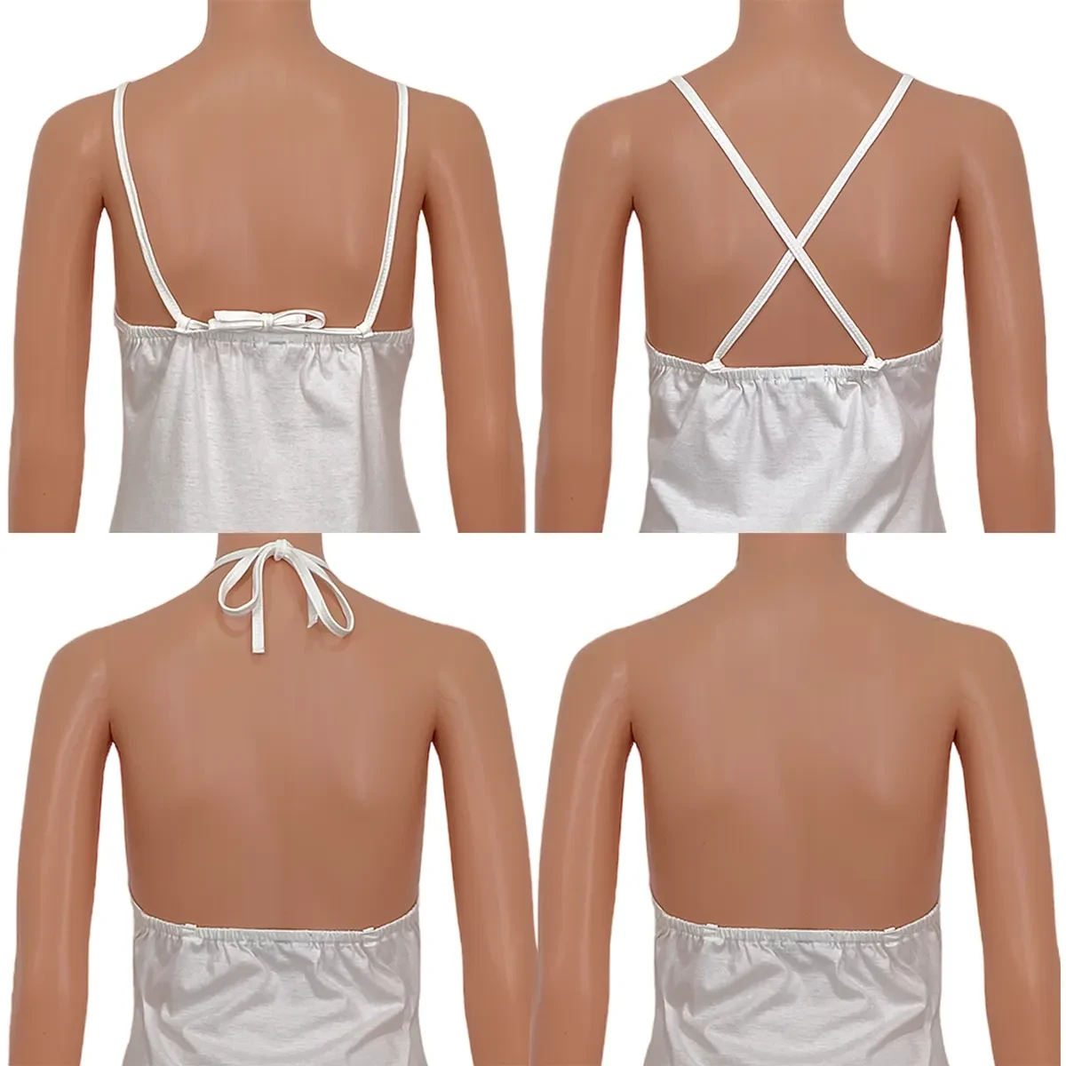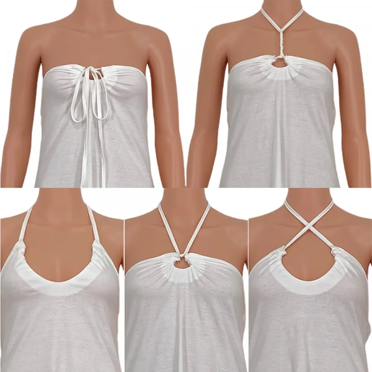 This dress with thin adjustable straps is a must-have for anyone who loves to mix trendiness with ease. The criss-cross straps on the back are fully adjustable, allowing you to personalize the look according to your preferences, just like the front straps. A delicate round neckline completes the design, making it perfect for any summer occasion.