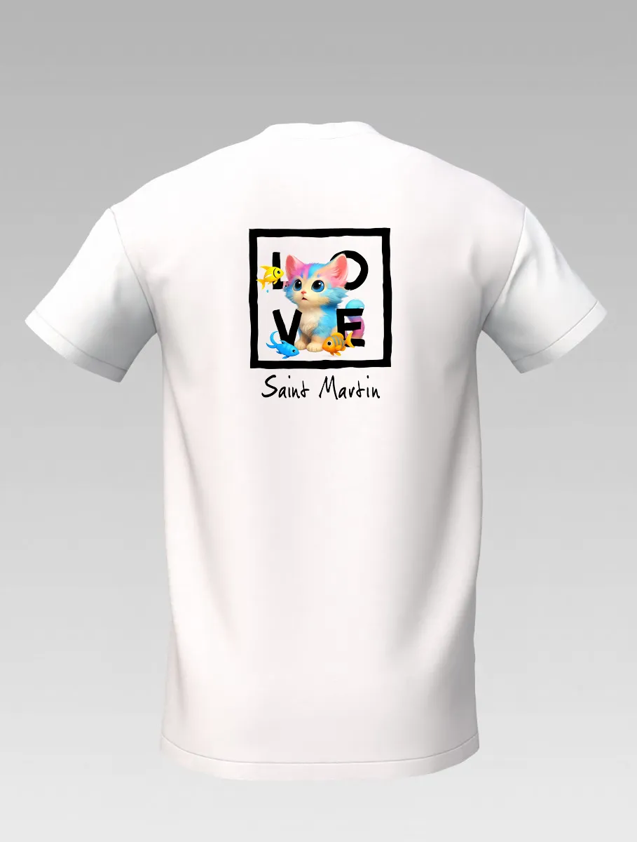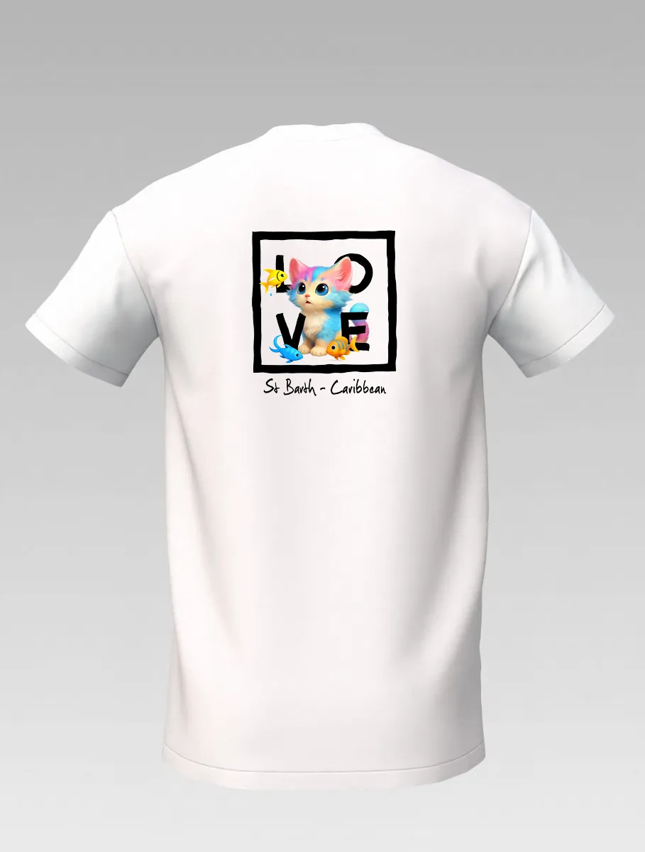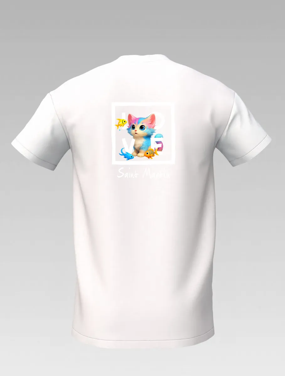 White Kids’ T-shirt – Playful Cat and Fish – St Barth & St Martin Signature – LOVE Edition