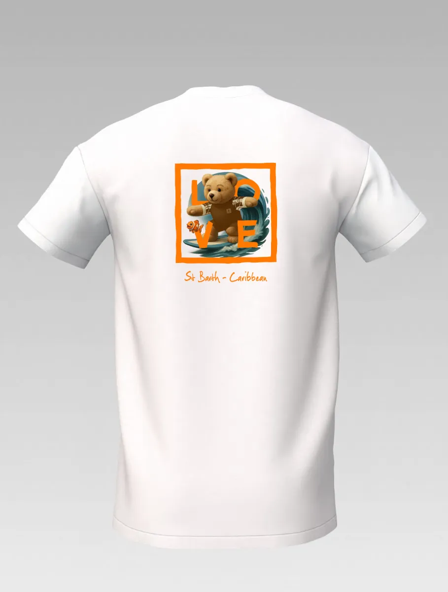 This white T-shirt from St Barth & St Martin, under the LOVE line, captures the essence of summer with its joyful and vibrant design.